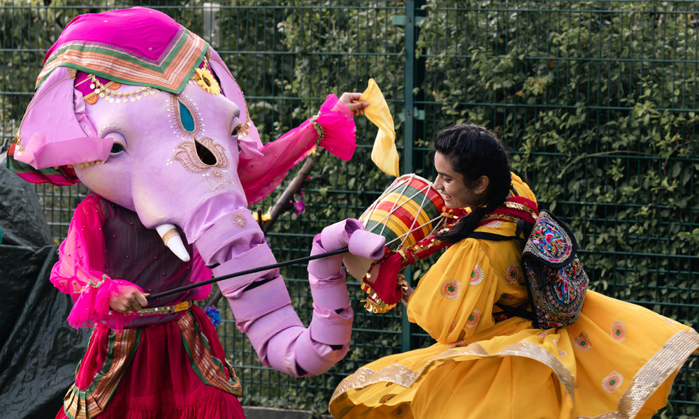 Elnaz the Elephant, Dholli the Drummer and Maalini the garden guardian are the best of friends and absolutely love music and dance. When Dholli starts playing, Elnaz and Maalini can’t stop themselves from dancing along! With live music and beautiful costumes Elnaz and Dholli lift the spirits of everyone they meet!