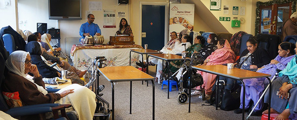 We have extensive experience of working with elders in care homes and day centres, including those with Parkinson’s, Dementia and the critically ill. Over the years, we have partnered with many organisations including: Alzheimer’s Solihull Café, Apna Ghar, Sampad, Black Country Touring and People Dancing to share high-quality South Asian arts experiences to elders of all backgrounds.